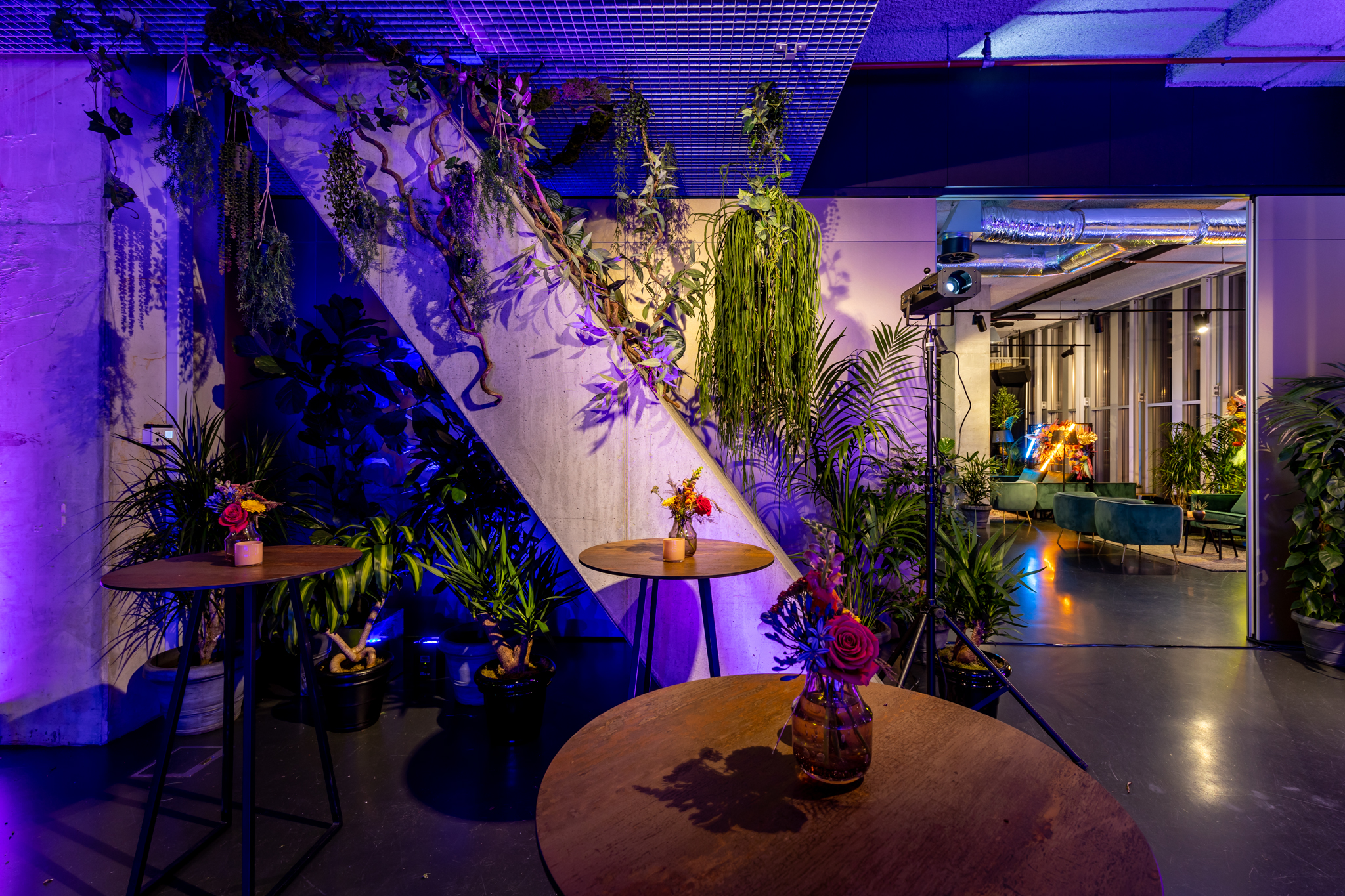 Om de feestelijke sfeer in de loft helemaal tot leven te brengen, hebben we gewerkt met een mix van stijlvolle en speelse decorstukken. Led tubes gecombineerd met schilderijlijsten zorgden voor een moderne, dynamische uitstraling. Luxe Chesterfield banken en goud/groene fauteuils boden comfortabele zithoeken voor de gasten. Discoballen in combinatie met Hot Metal kolommen brachten een feestelijke glans en energie in de ruimte.